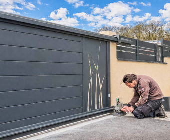 En aluminium et d’une longueur de 15 m, la clôture “Signature Nordet” est également de couleur Gris 7016 texturé et équipée de décors Herbage. Ajourée par les espacements entre ses lames horizontales, elle offre la juste intimité nécessaire tout en s’harmonisant parfaitement au portail. Elle a également été posée et solidement fixée sur le muret existant par